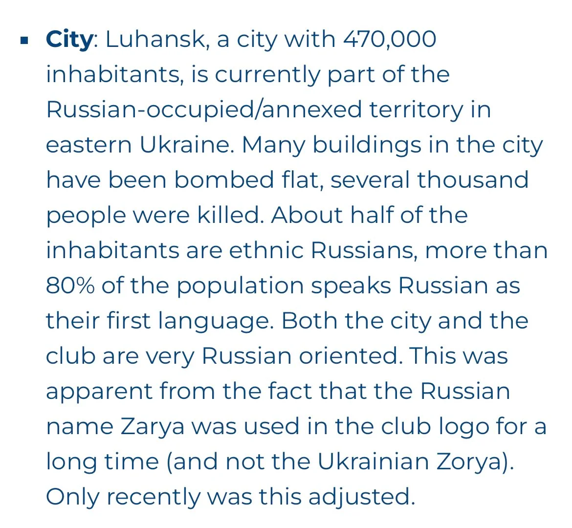 В частности, в описании Луганска, который оккупирован Россией с 2014 года, "буйволы" опубликовали следующую формулировку. "Около половины жителей города – этнические русские, для более 80% населения русский язык является родным. И город, и клуб очень российскоориентированы.
