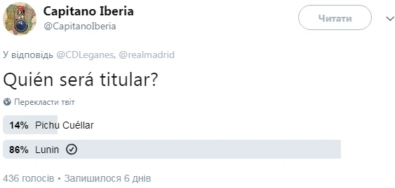 В импровизированном опросе одного из фанов Леганеса, кто должен быть №1, Лунин уверенно обошел опытного Куэльяра.