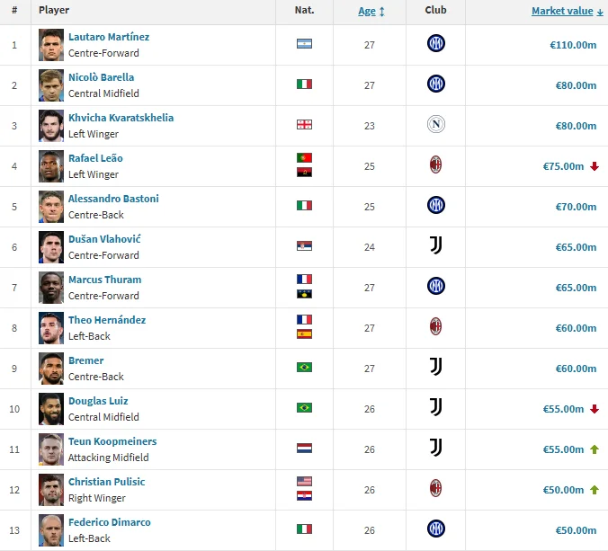 Самым дорогим игроком Серии А остается аргентинский нападающий Интера Лаутаро Мартинес (110 млн евро). В топ-3 вошли также грузинский нападающий Наполи Хвича Кварацхелия и хавбек Интера Николо Барелла (оба – по 80 миллионов).