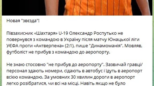 Как сообщалось ранее, молодежная команда донецкого Шахтера после выездного матча с Антверпеном (2:1) в рамках 2-го тура Юношеской лиги УЕФА не смогла в полном составе покинуть Бельгию. Полузащитник Александр Роспутько не прибыл в аэропорт – там была найдена лишь его форма. Игрок полностью исчез с радаров – не выходит на связь, а также "зачистил" свои соцсети.