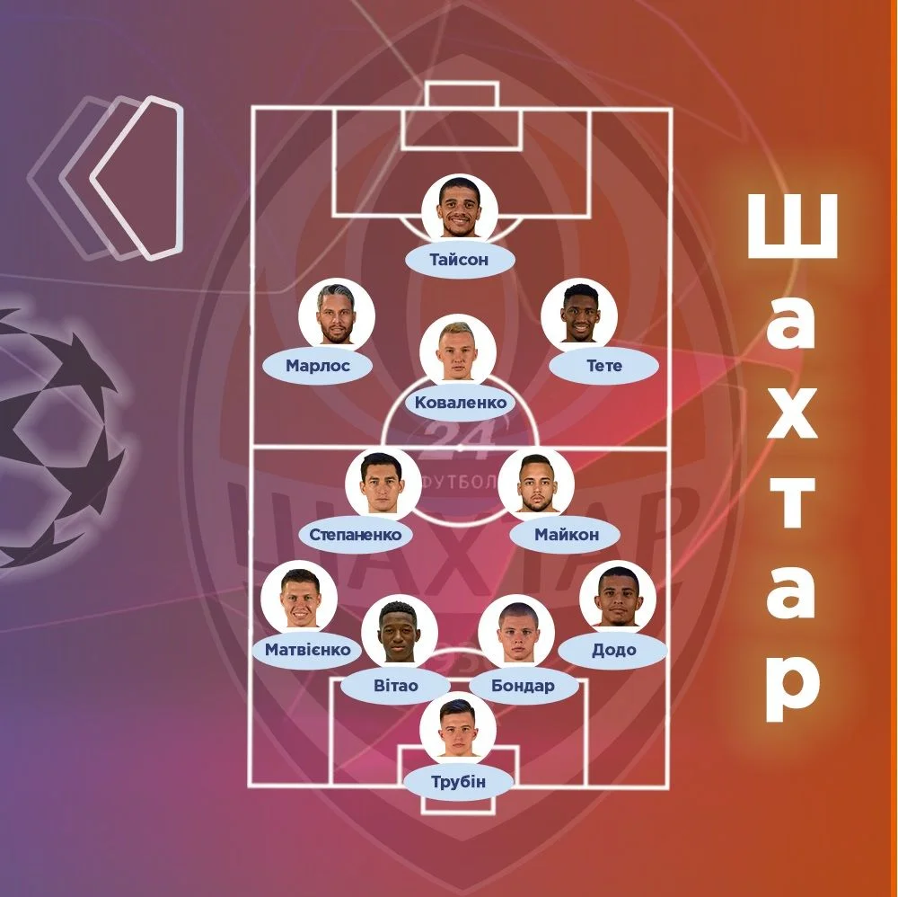 Шахтер: Трубин – Додо, Бондарь, Витао, Матвиенко – Степаненко, Майкон – Тете, Коваленко, Марлос – Тайсон.