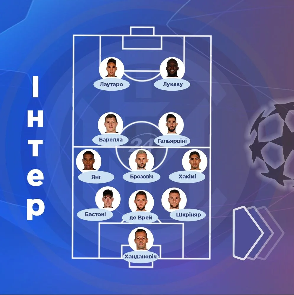 Интер: Ханданович – Шкриняр, де Врей, Бастони – Хакими, Барелла, Брозович, Гальярдини, Янг – Лаутаро, Лукаку.