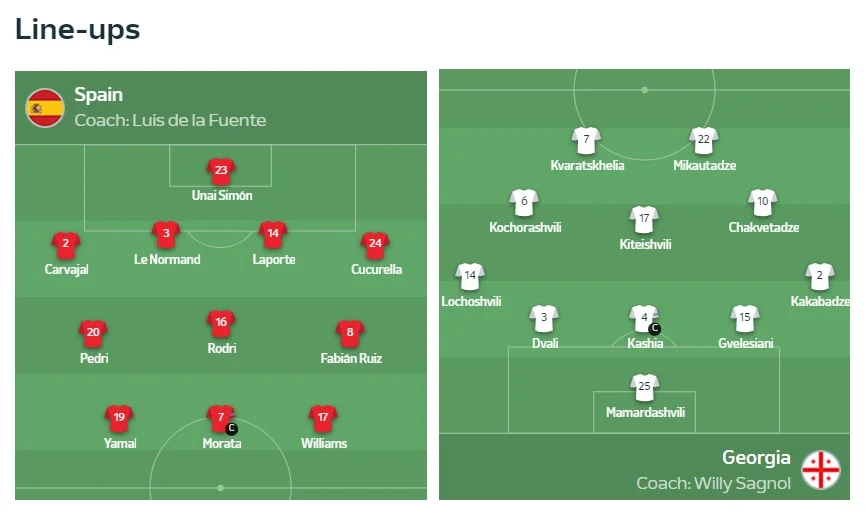 Испания: Симон – Карвахаль, Ле Норман, Ляпорт, Кукурелья – Педри, Родри, Фабиан Руис – Ямал, Мората, Уильямс