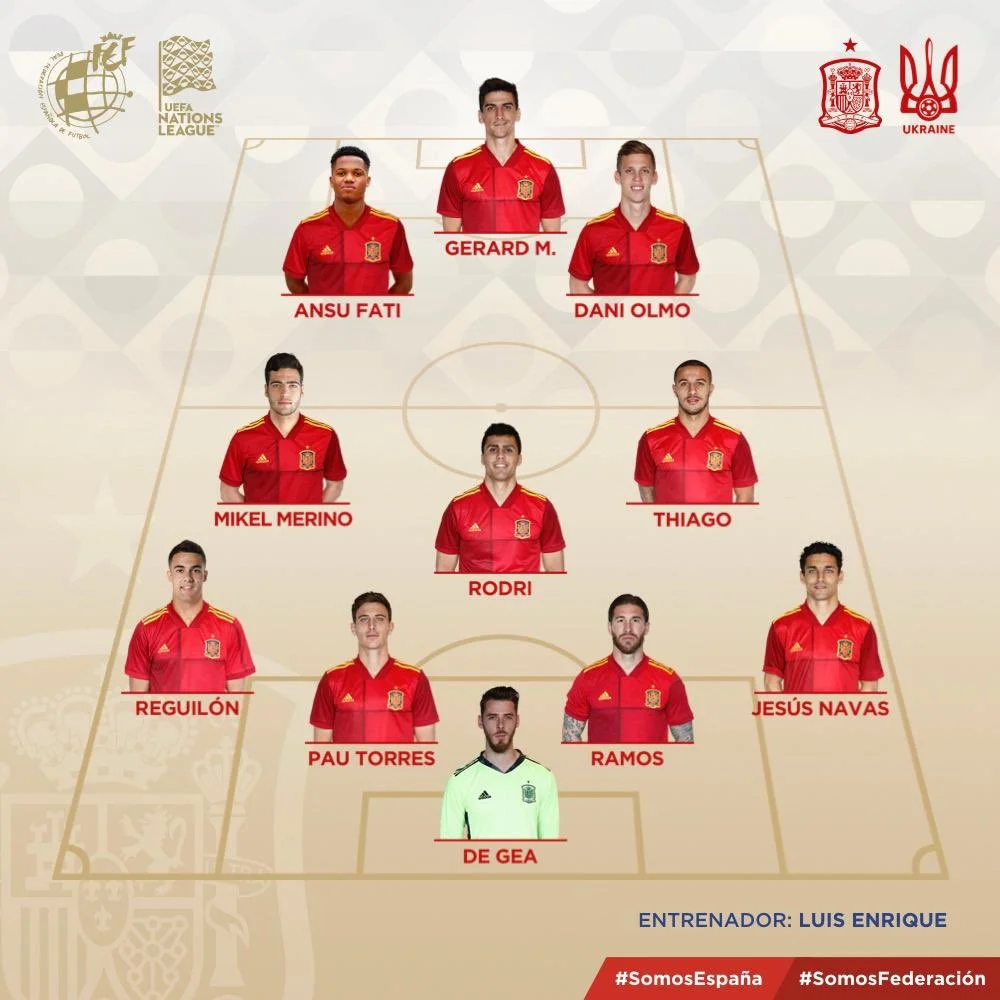 Испания: Де Хеа – Навас, П. Торрес, Рамос, Регилон – Ольмо, Родри, Алькантара, Мерино – Морено, Фати