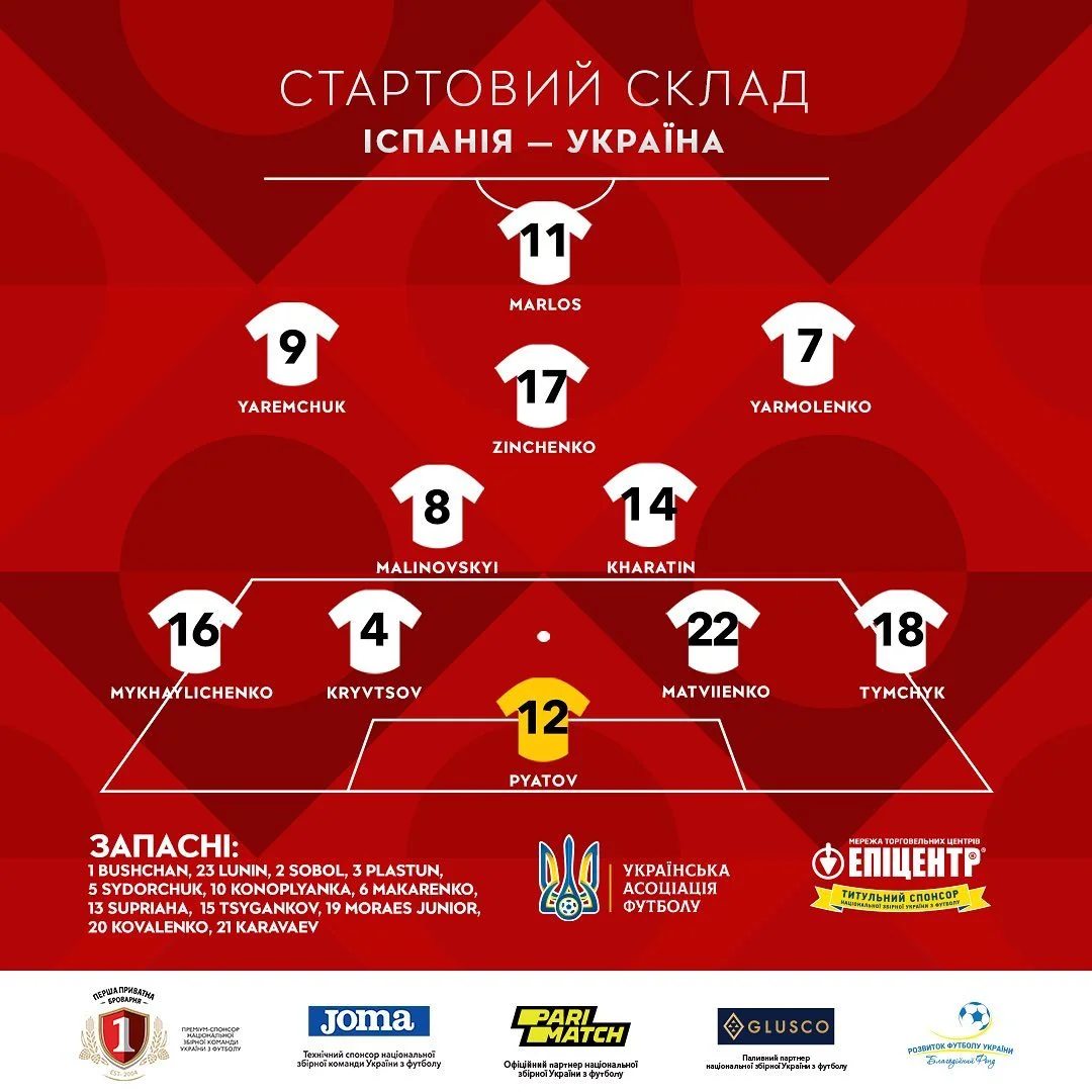 Україна: Пятов – Тымчик, Кривцов, Матвиенко, Михайличенко – Харатин, Малиновский – Ярмоленко, Зинченко, Яремчук – Марлос