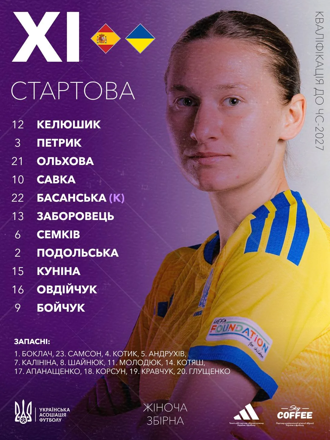 Стартовый состав сборной Украины: Келюшик, Петрик, Ольховая, Савка, Басанская, Заборовец, Семкив, Подольская, Кунина, Овдийчук, Бойчук.