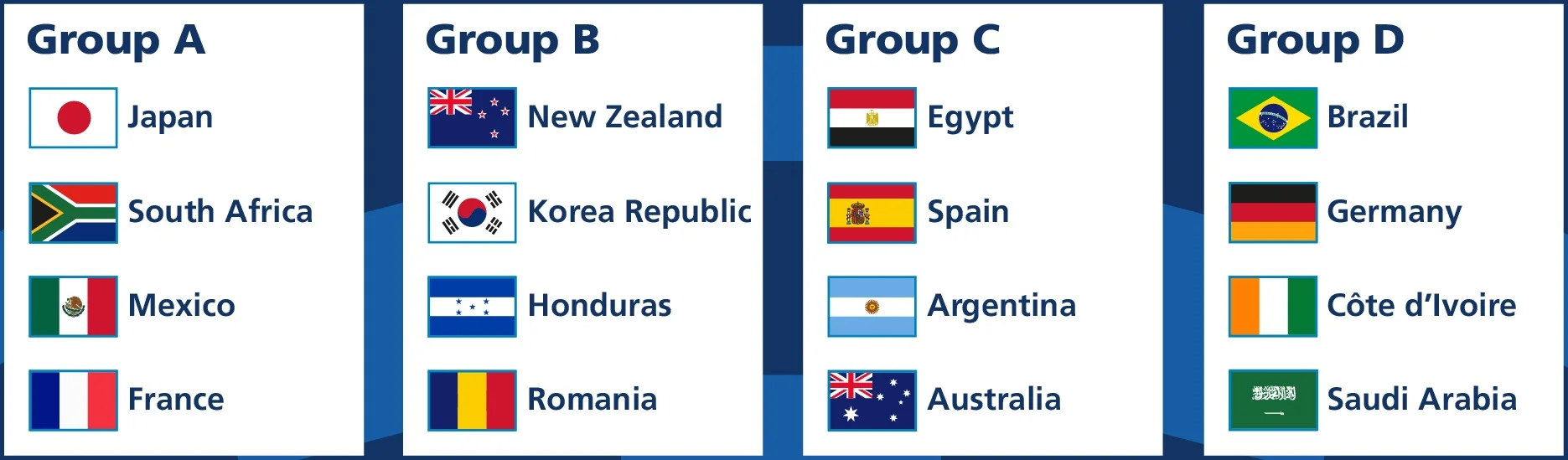 Ще по 3 команди від Африки та Азії, а Нова Зеландія захищає честь Океанії. Як помітно, через бажання охопити всі континенти і велику квоту для периферії, рівень суперництва на груповому етапі досить скромний.