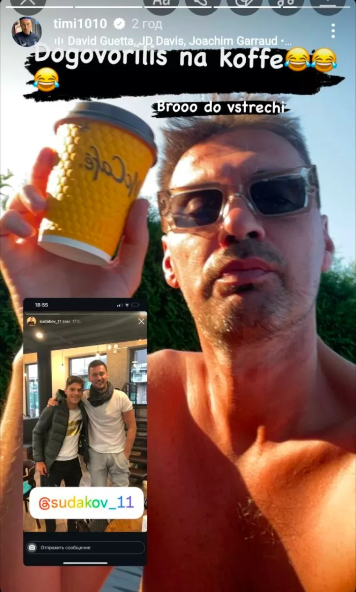 Короче, договорились во вторник кофе выпить. Я вообще большой поклонник Судакова. У меня с ним есть совместные фотки, еще когда он малым был. Тем более мы с ним две "десятки". У нас общее уважение друг к другу. Младшее поколение очень дисциплинированное и режимное, в отличие от нас. Приятно наблюдать за молодежью.