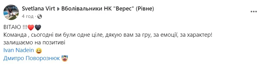 Верес разбил МФК Металлург со счетом 6:1, однако это не повлияло на решение разойтись с Виртом. Сначала любимая уже экс-тренера ровенцев поздравила команду с сохранением прописки в элите. В публикации Светлана "прикрепила" у фамилии президента клуба Ивана Надеина эмодзи с улыбкой, а у нападающего-блогера Дмитрия Поворознюка – клоуна.