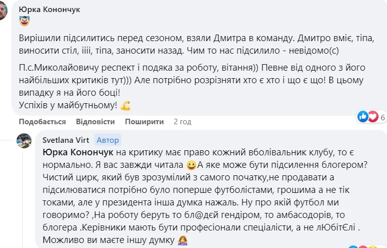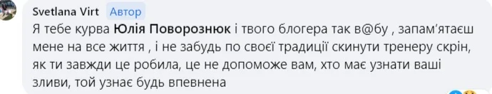 Терять уже было нечего, потому Светлана дала волю эмоциям. Жена Вирта жаловалась на "цирковую" трансферную кампанию Вереса, "бл*дей-гендиров", "гнид" и "ку*в". Последние оскорбления были "посвящены" жене Поворознюка, Юлии, якобы "сдавшей все руководство". На прощание Светлана пообещала "в**ать" пару так, что "запомнят всю жизнь".