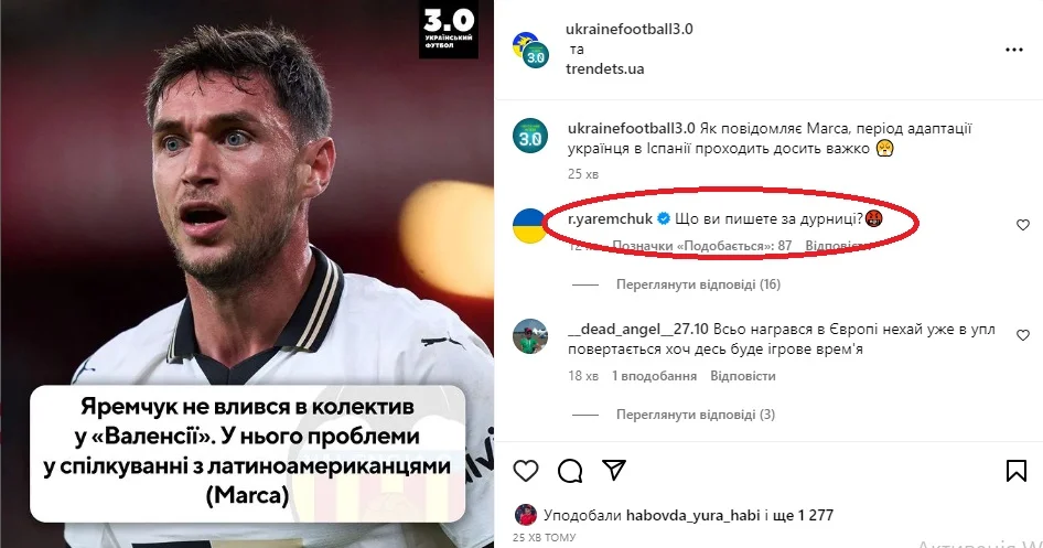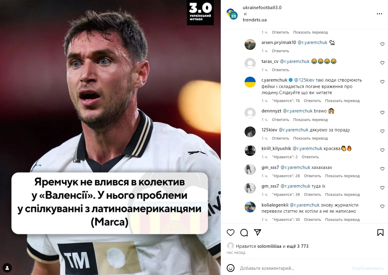 Такой инсайд буквально "взорвал" спокойствие Яремчука – нападающий взялся опровергать вышесказанное. В частности, на странице "Трендеца" в Instagram Роман гневно написал: "Что вы пишете за глупости?", а в комментариях добавил: "Такие люди создают фейки, и складывается плохое впечатление о человеке. Следите, что вы читаете".