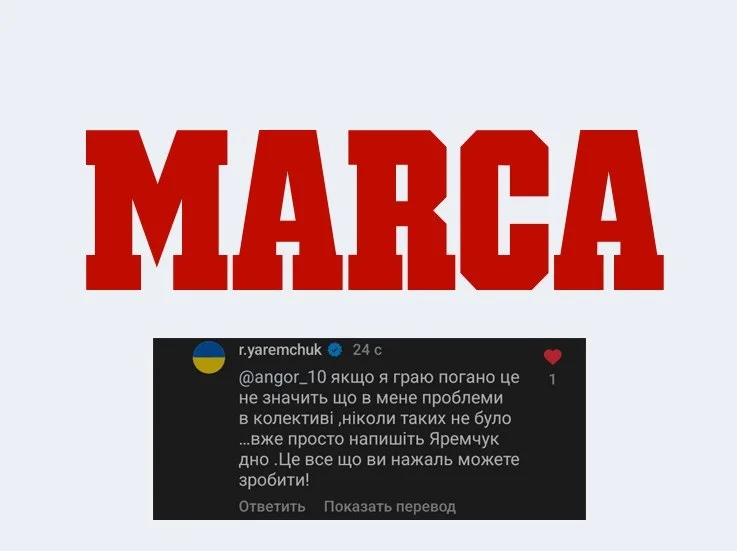 Кроме того, он высказал претензии к испанской Marca, которая одна из первых опубликовала вышеупомянутый инсайд: "Если я играю плохо – это не значит, что у меня проблемы в коллективе. Никогда таких не было. Уже просто напишите: Яремчук – дно. Это все, что вы, к сожалению, можете сделать".