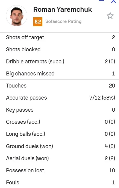 К сожалению, Яремчук не воспользовался своим шансом. Форвард сборной Украины имел две возможности до перерыва, однако бил неточно. Портал Sofa Score выписал Роману 6,2 балла (худшая оценка на две команды).