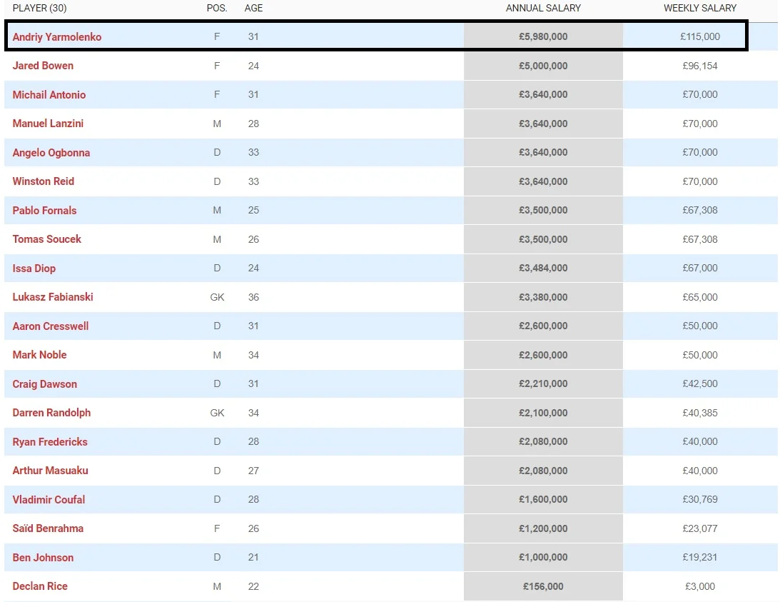 Ближайшим преследователем Ярмоленко в платежной ведомости является Джаррод Боуэн. Конкурент Андрея, который преимущественно играет на правом фланге атаки, за год получает ровно 5 миллионов.
