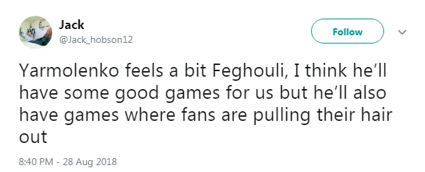 "Ярмоленко напоминает Фегули. Думаю, у него будут некоторые замечательные матчи за нас, но также мы увидим в его исполнении игру, из-за которой фанаты будут рвать на себе волосы".