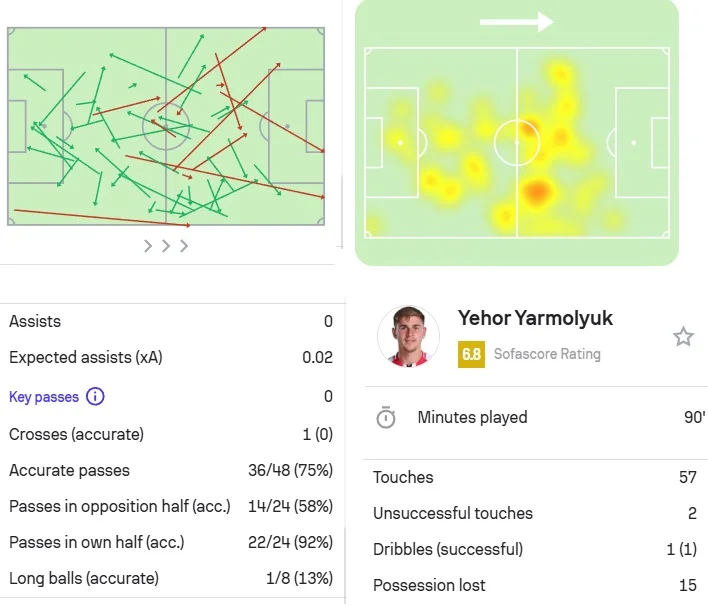Подопечные Кита Эндрюса в принципе были ближе к успеху, но матч завершился без голов. Ярмолюк завершил его 4 единоборствами на земле (2 успешных), выиграв обе верховые дуэли и выполнив 5 возвратов мяча. Был и 1 успешный отбор, хотя не стоит забывать и разрезной пас перед перерывом – он прошел мимо Ярмолюка в штрафную и завершился ударом Сесеньона над воротами.