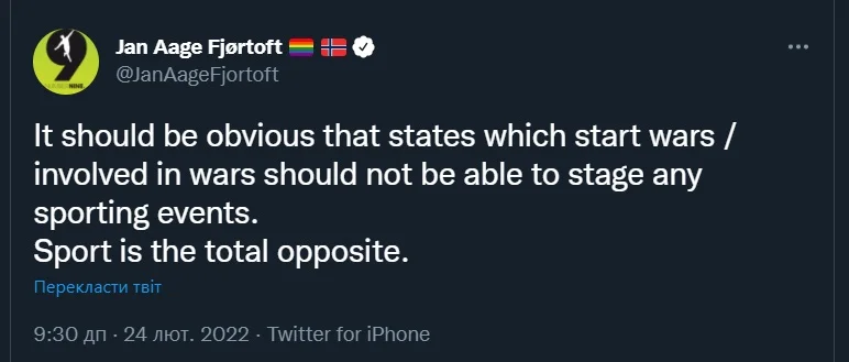 Фьёртоф убежден, что за такие действия нужно отвечать: "Видимо, очевидно, что государства, развязывающие войны/участвующие в войнах, не должны иметь возможности проводить какие-либо спортивные мероприятия. Спорт – полная противоположность".