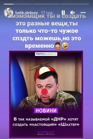 ""Эмемемщик, ты и создать – это разные вещи. Ты только что-то чужое спи**ить можешь, но это временно", – написал Белик, прикрепив фото Пушилина в образе клоуна.