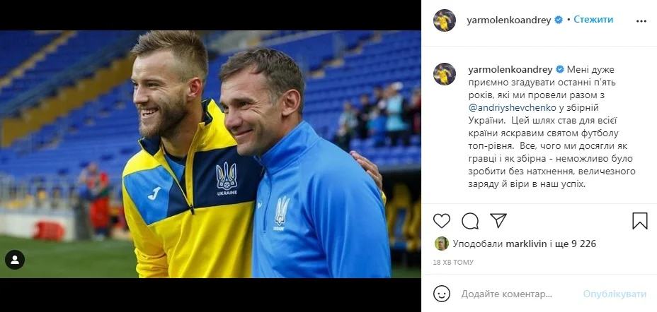 Все, чего мы достигли как игроки и как сборная, невозможно было сделать без вдохновения, огромного заряда и веры в наш успех. Как команда мы прошли очень серьезную школу. Я искренне благодарю Шевченко за уважение, доверие и преданность футболу!" – написал Ярмоленко в своем Instagram.
