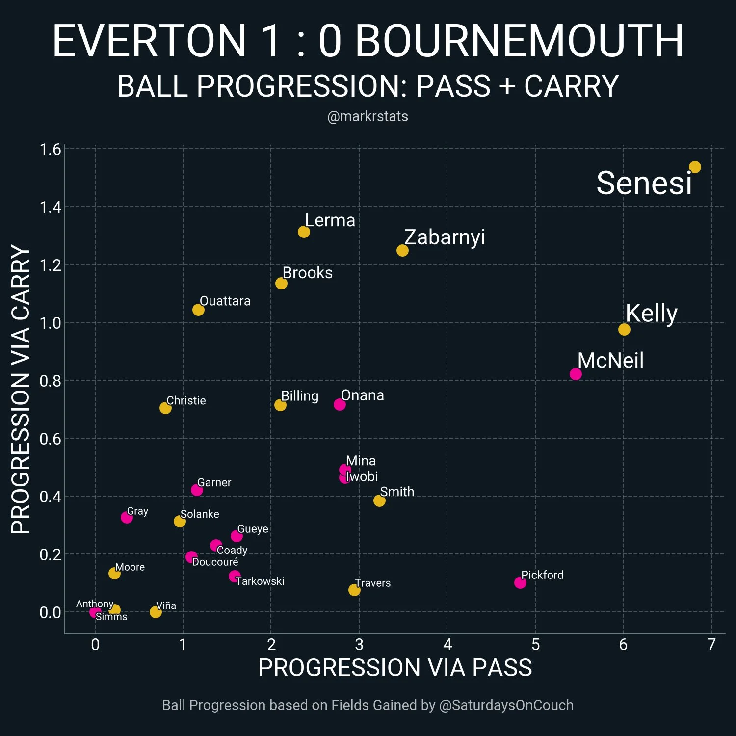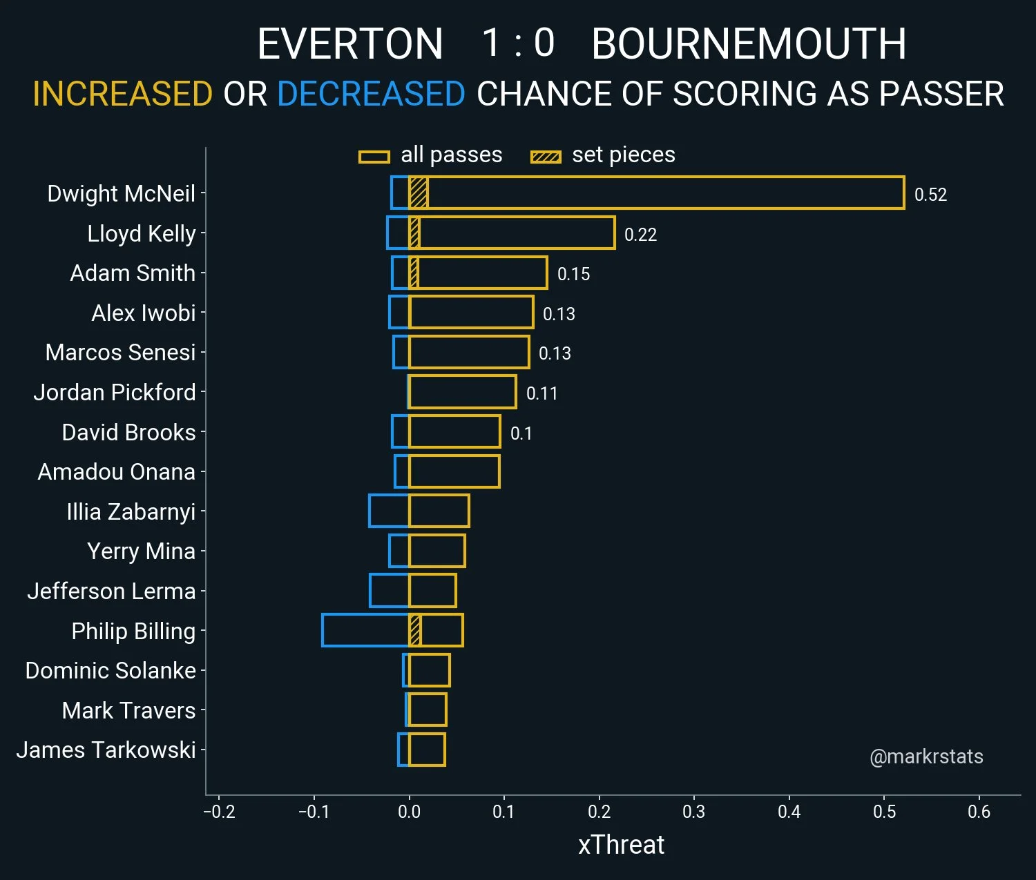 Привозит Тарковски, Брукс находит идеальный момент для Соланке, однако Мина блокирует. Гости даже интереснее начали играть под занавес тайма. У Эвертона вдвое больше касаний в чужой штрафной, однако по ожидаемым голам это выливается лишь в незначительное преимущество (0,49:0,34). Куча навесов могла, впрочем, завершиться голом. Гарнер хорошо поймал на ногу мяч после выноса голкипера, но Траверс успел подняться на ноги и потащить из-под перекладины. Борнмут чуть чаще владел мячом и пасовал, зато у Эвертона больше стандартов и 3:0 по попаданиям в створ ворот.