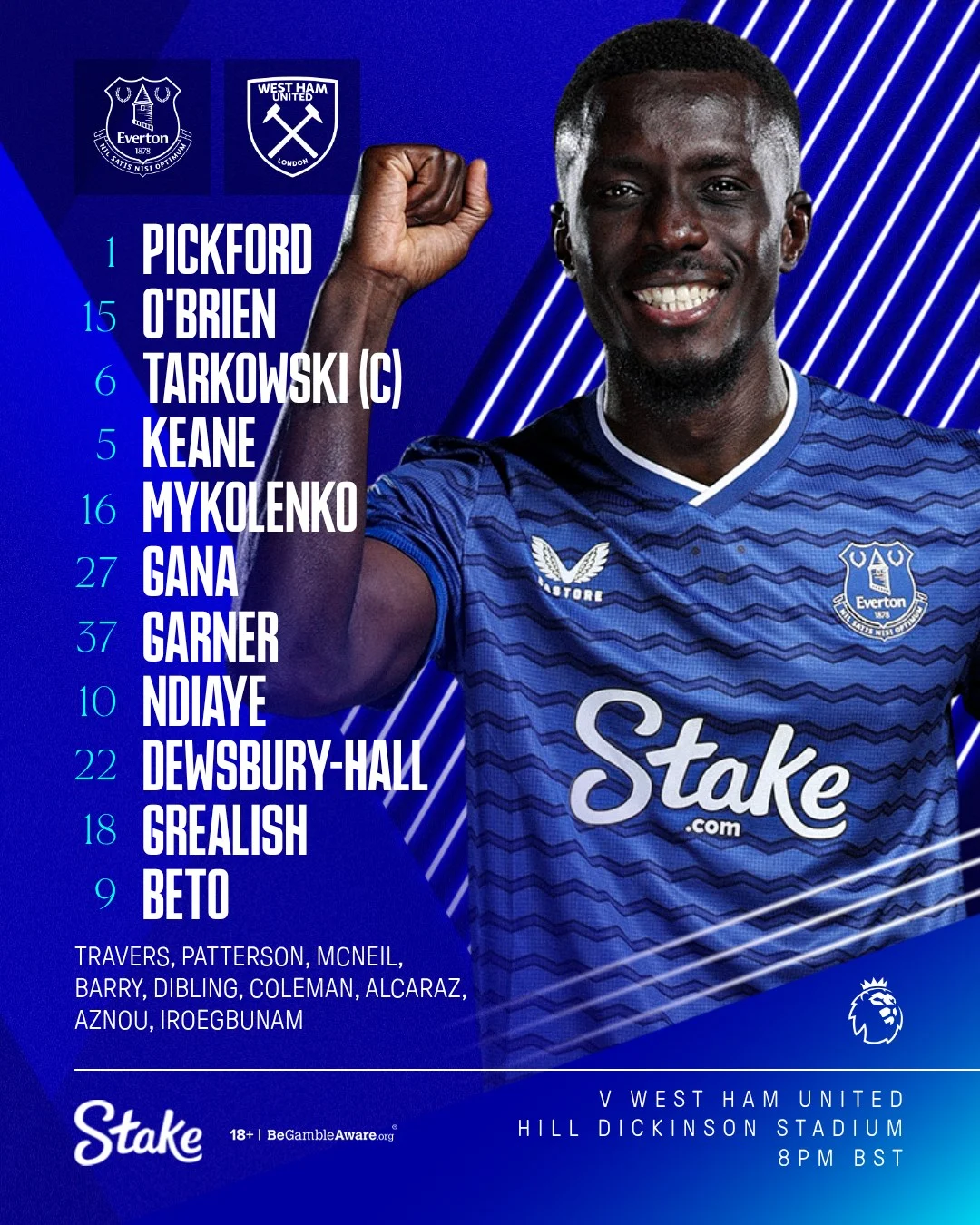 Стартовый состав Эвертона: Пикфорд – О'Брайен, Тарковски, Кин, Миколенко – Гуйе, Гарнер – Ндиайе, Дьюсбери-Холл, Грилиш – Бету.