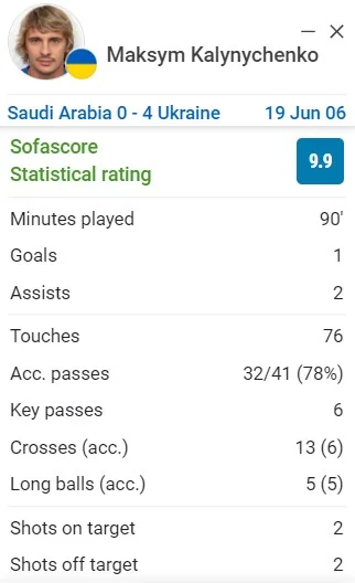 Лучший перфоманс турнира в активе... Максима Калиниченко. Не среди украинцев, нет. На всем Мундиале! Калиниченко получил оценку 9.9 за матч против Саудовской Аравии, в котором оформил два ассиста со стандартов в начале каждого из таймов (замыкали Русол и Шевченко) и завершил дело голом.