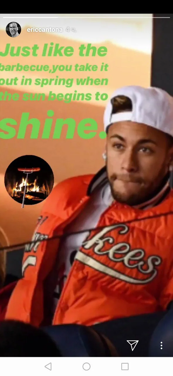 Эрик написал: "Это прямо как барбекю. Его тоже всегда выносишь на улицу весной, когда начинает светить солнце", – и добавил фотографию Неймара, который наблюдает за футболом с трибун.