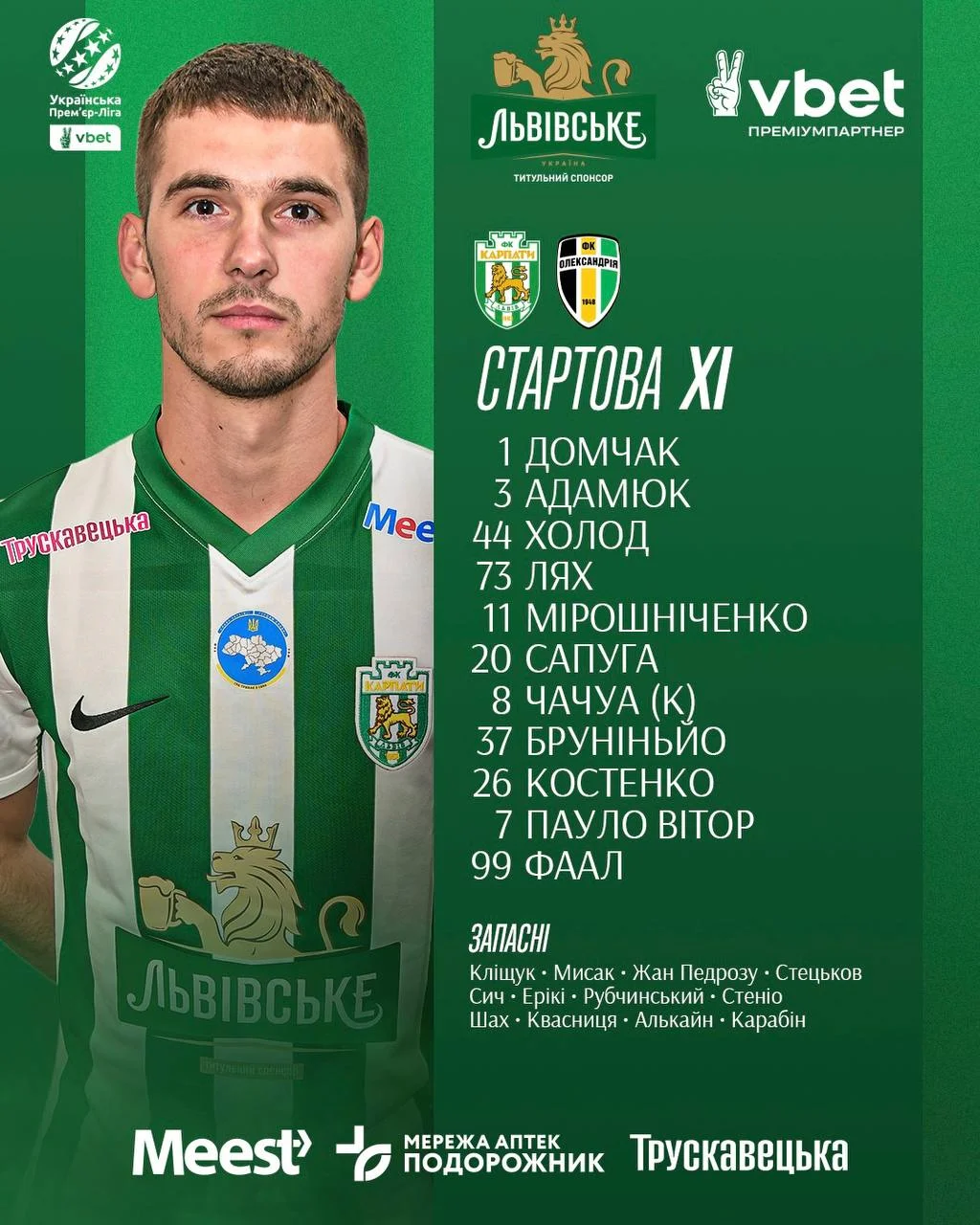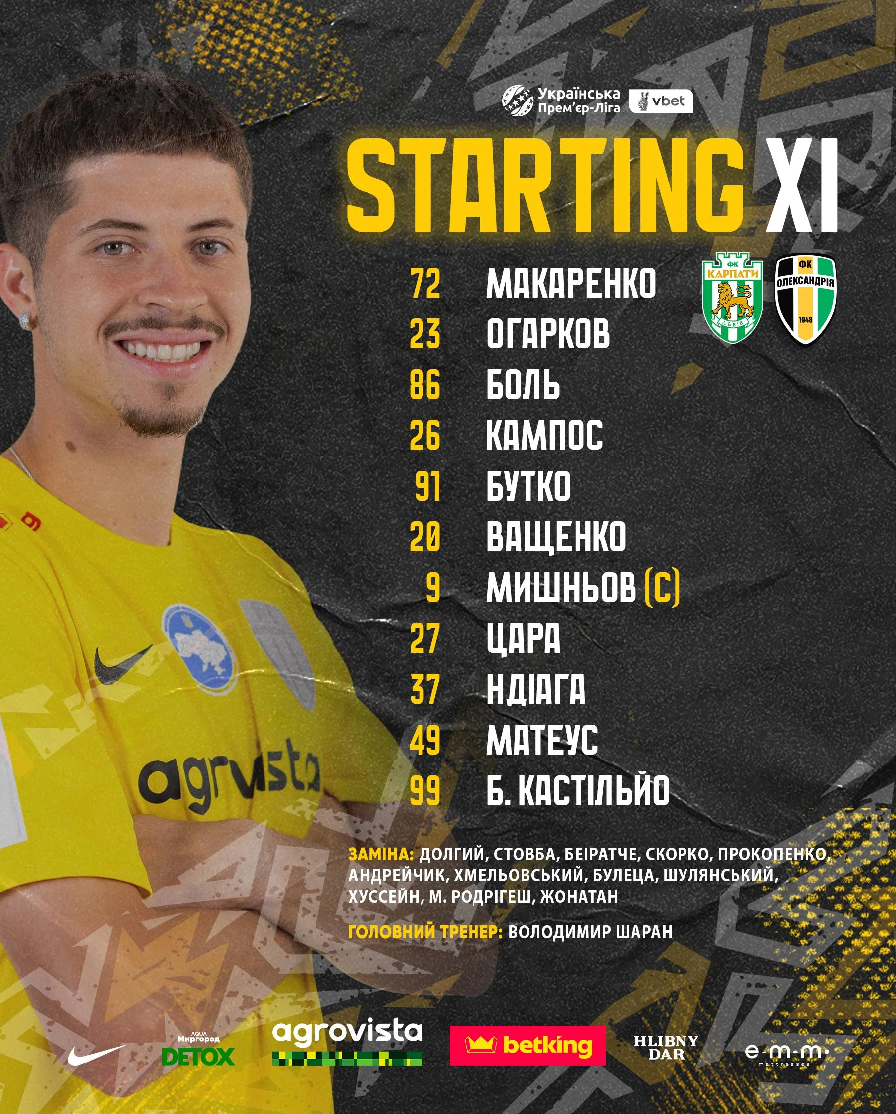 Стартовый состав Карпат: Домчак – Мирошниченко, Адамюк, Холод, Лях – Сапуга, Чачуа, Бруниньо – Пауло Витор, Фаал, Костенко.
