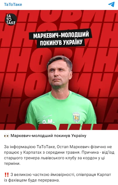 Остап Маркевич, который работал ассистентом в тренерском штабе своего отца Мирона Маркевича, покинул Украину, сообщает "ТаТоТаке".