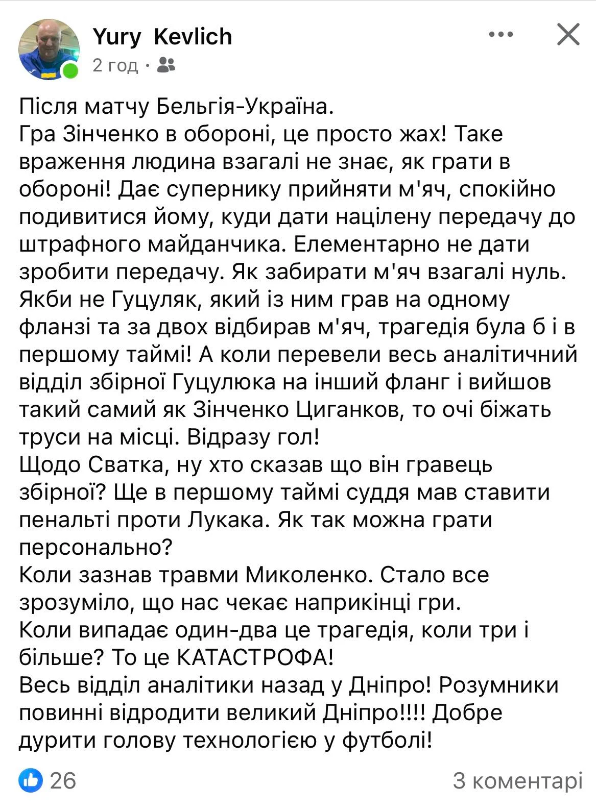 Весь отдел аналитики обратно в Днепр! Умники должны возродить великий Днепр!!! Хорошо дурить голову технологией в футболе", – написал Кевлич на своей странице в Facebook.