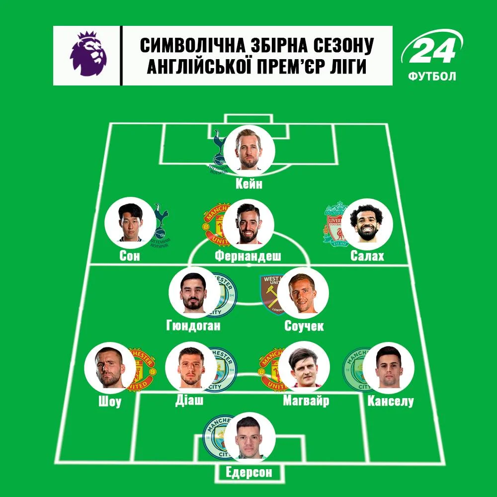 Едерсон (Манчестер Сіті) – Канселу (Манчестер Сіті), Магвайр (Манчестер Юнайтед), Діаш (Манчестер Сіті), Шоу (Манчестер Юнайтед) – Салах (Ліверпуль), Соучек (Вест Хем), Гюндоган (Манчестер Сіті), Бруну Фернандеш (Манчестер Юнайтед), Сон (Тоттенхем) – Кейн (Тоттенхем)