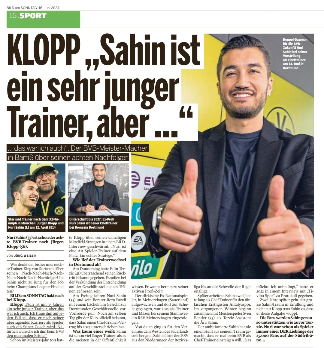 "Нури всего 35, он очень молодой тренер. Но я начинал в таком же возрасте. Верю, что после роскошной игровой карьеры он также станет суперовым тренером. Конечно, я желаю ему максимального успеха в Боруссии", – сказал Клопп для Bild am Sonntag.
