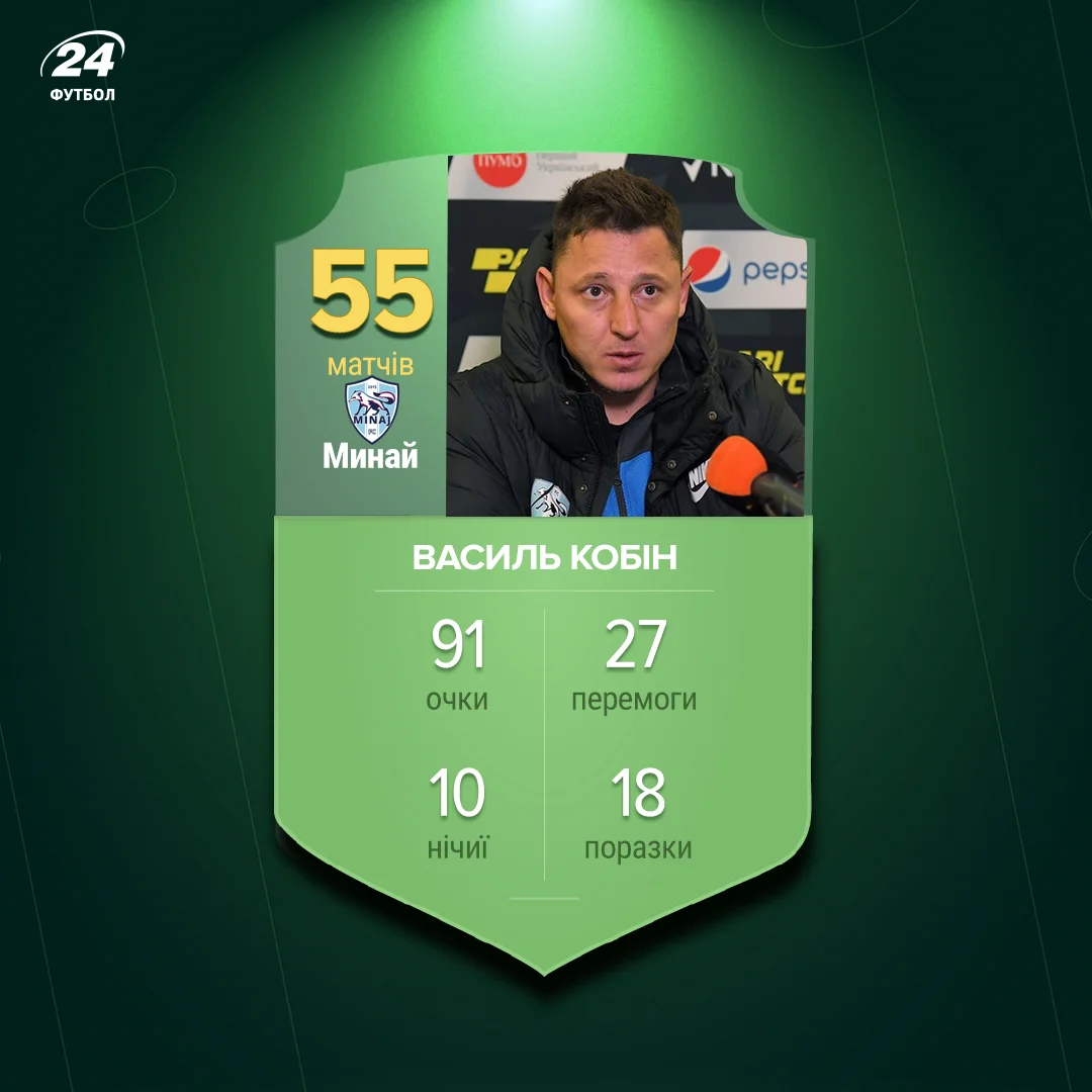 Напомним, 35-летний специалист возглавил команду в 2019 году. За это время Минай провел 55 матчей, выиграл Первую лигу сезона 2019/20, вышел в полуфинал Кубка Украины, дебютировал в УПЛ. Кто заменит Кобина на посту главного тренера, будет объявлено позже.