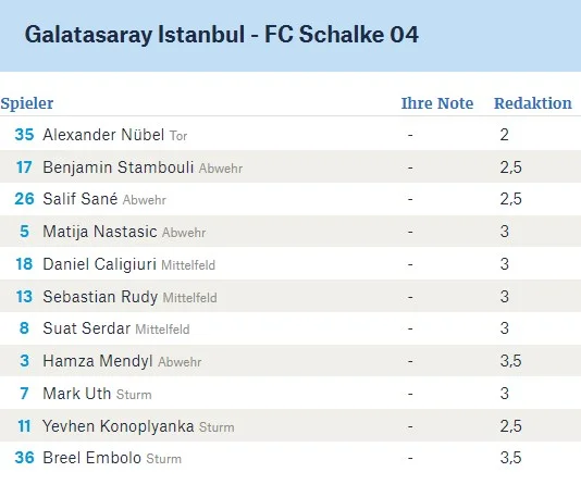 Даже критичные относительно Евгения Ruhr Nachrichten высоко оценили его старания в Стамбуле – оценка 2,5 от редакции. Опять же только молодой вратарь Александер Нюбель имеет высший балл.