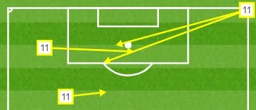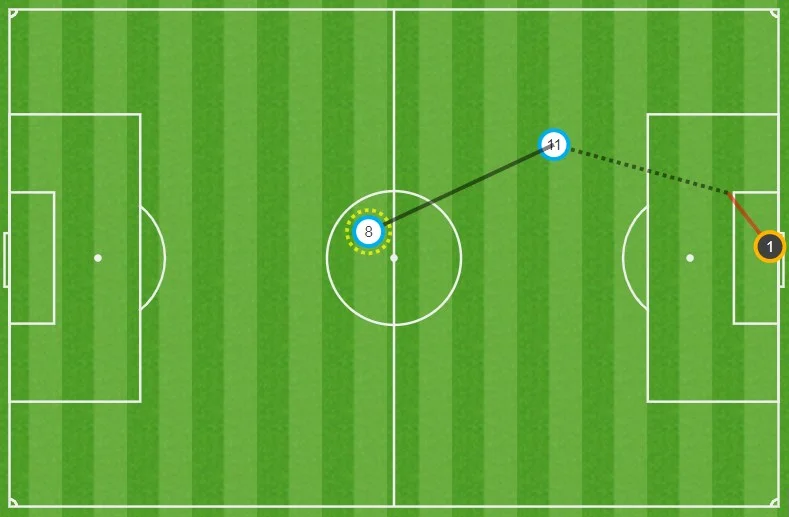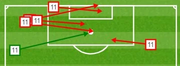 Почти все, что Шальке создал в атаке, было следствием усилий Коноплянки. Украинец нанес 4 удара по воротам россиян. Если в первом тайме один выстрел пролетел очень далеко от "девятки", а второй – заблокировали соперники, то после перерыва Евгений дважды выстрелил с острого угла в створ. Локомотив спасся сейвами голкипера. Это были персональные рейды в штрафную – Коно получал мяч и самостоятельно выходил (пунктир ниже) на ударную позицию.