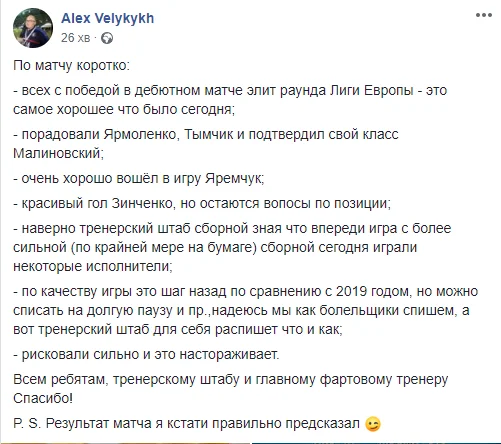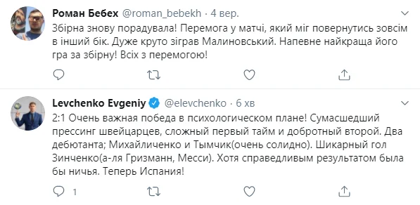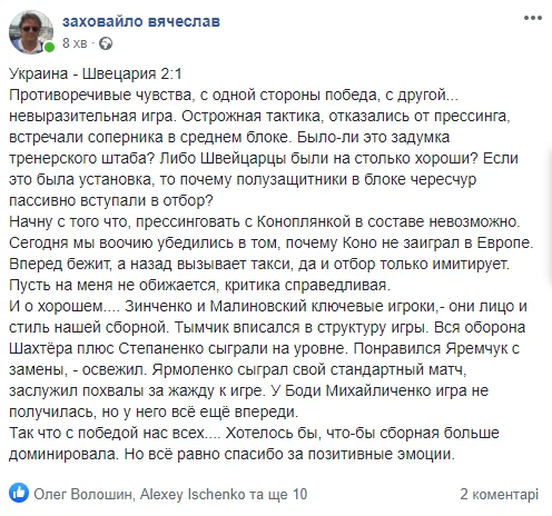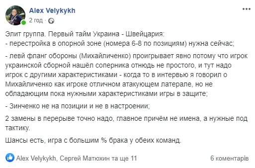 Зато после перерыва тон комментаторов несколько смягчился. Своевременные замены от Шевченко + победный гол Зинченко увеличили дозу оптимизма. От комплиментов не удержался даже официальный Twitter-аккаунт Манчестер Сити: "Благодаря этому человеку Украина только что вышла вперед со Швейцарией".