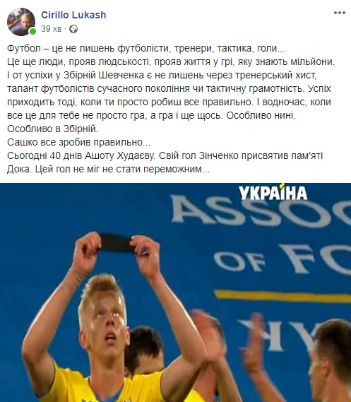 Зина посвятил этот гол светлой памяти умершего от коронавируса доктора национальной команды Антона Худаева. Харьковский журналист Кирилл Лукаш отметил благородный поступок.