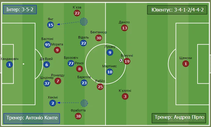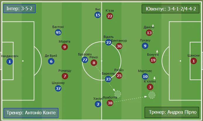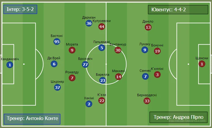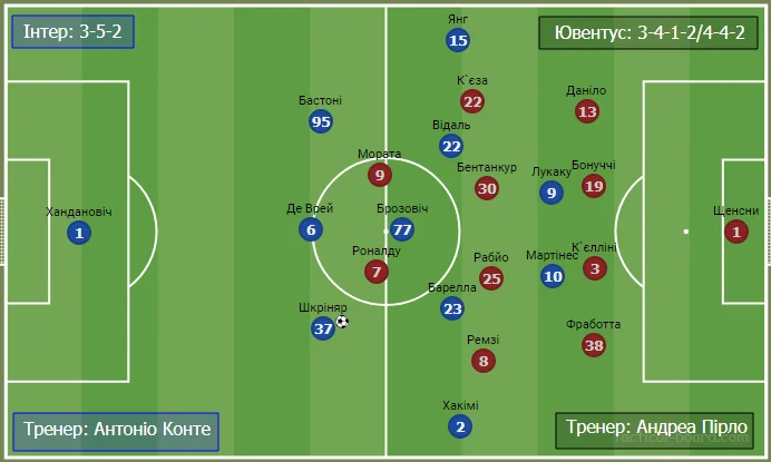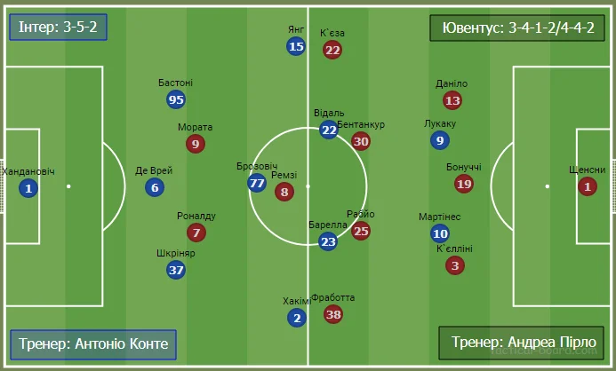 Стартовий склад господарів поля був достатньо прогнозованим. Конте не міг розраховувати лише на Д'Амброзіо та Весіно, але всі ключові бійці перебували у строю. У Ювентуса кадрові проблеми значно суттєвіші - Дибала травмований, а Куадрадо, Алекс Сандро та Де Лігт - на карантині. Щодо тактичних формацій, Конте зіграв по своїй незмінній схемі – 3-5-2. Пірло також покладався на власну базову структуру – гібрид 3-5-2/4-4-2.