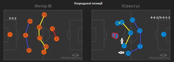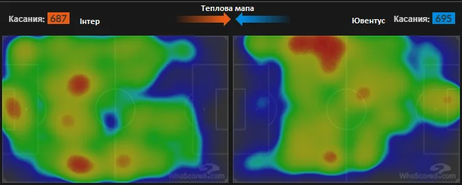 Навіть у плані володіння м'ячем Інтер також не поступився поки що чинним чемпіонам Італії. На тепловій мапі чудово видно, як активно Ювентус намагався розвивати свої атаки через правий фланг. Саме у ближній півпростір до цієї вертикальної зони часто зміщувалися форварди. У створенні перевантаження також брав участь Рабйо.