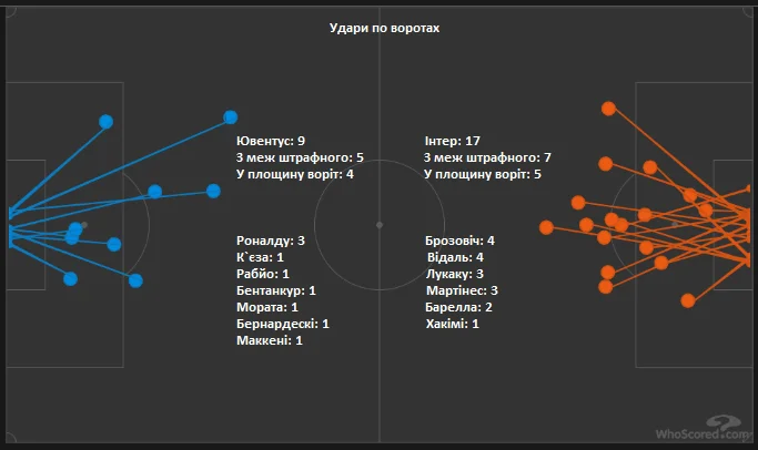 Команда Конте багато била по воротах з-за меж штрафного. До речі, найбільшу кількість ударів мають центральні півзахисники Інтера Брозовіч та Відаль – по 4.