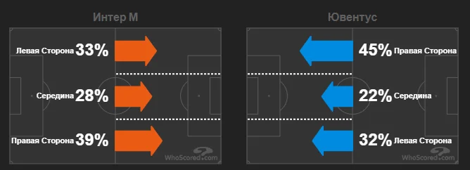 Інтер - навпаки. Більш активним виявився на своєму правому фланзі, але взагалі дії господарів були більш збалансованими. Щодо горизонтальних зон, то, як і у Римському дербі, впевнено перемогла команда, яка значно менше володіла м'ячем на третині поля суперника. Цих 22% Інтера могло цілком вистачити і на чотири чи навіть п'ять голів. Від розгромної поразки Ювентус врятувала лише не найкраща реалізація моментів суперника.