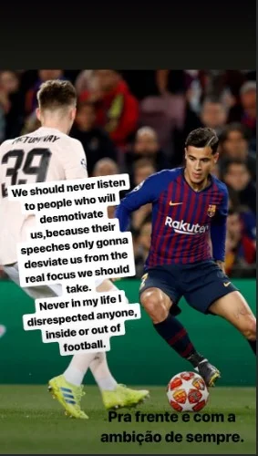 "Мы никогда не должны слушать людей, которые пытаются нас демотивировать, потому что их слова отвлекают от реальной цели. Я никогда не выказывал своё неуважение никому на футбольном поле или вне его", – поделился Коутинью в своей стори Instagram.