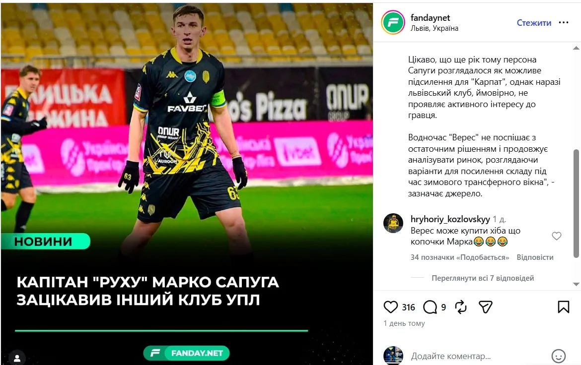“По информации из наших источников, ровенский Верес после ухода Валерия Кучерова активно ищет варианты для усиления опорной зоны. Среди кандидатов, на которых обратили внимание, в клубе фигурирует 22-летний капитан львовского Руха Марко Сапуга”, – сообщил Telegram-канал UPL Inside.