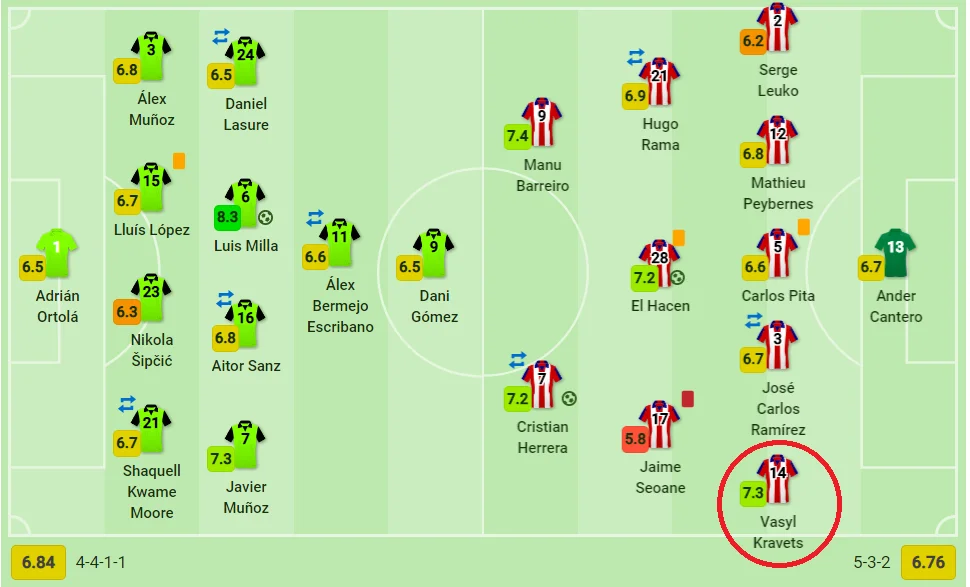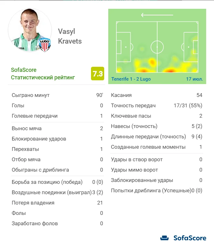 Кравец вернулся в основу своей команды и провел довольно качественный матч. Простая и надежная игра сзади, несколько подач в штрафную (правда, низкая точность передач в целом). Вишенкой стал ассист на Эль-Хасена во время решающего гола. Все это принесло Василию 7,3 балла от SofaScore – второй результат в команде.