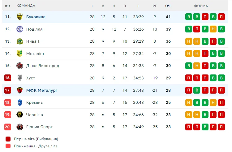 Кремень, Чернигов и Горняк-Спорт вылетели во Вторую лигу, Металлург и Хуст сыграют в плей-офф за выживание