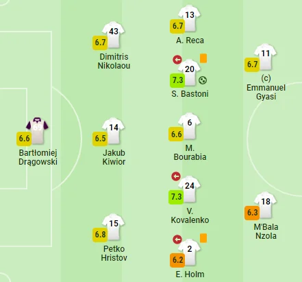 Орсолини в ответ проверил бдительность Дронговски с дальнего расстояния. В конце тайма украинец пробивал сам, но защитники заблокировали удар и вынесли снаряд на угловой. Уже в добавленное время Бастон восстановил статус-кво, забив гол в раздевалку: Симоне отважился на несильный удар в угол ворот – Скорупски не видел момента выстрела и даже не шелохнулся.