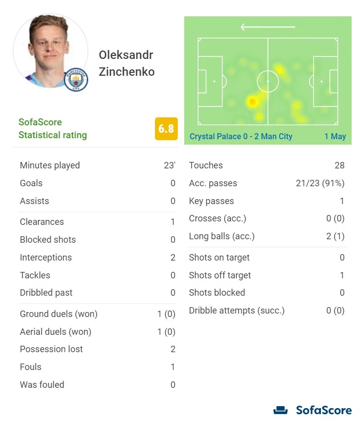 Все стало понятно. На последние 25 минут Гвардиола выпустил Зинченко. Александр вышел вместо Фернандиньо и действовал в центре поля, располагаясь рядом с Родри. Традиционно много разыгрывал с партнерами, поддерживал атаки. В конце матча украинец создал момент для Стерлинга: выгрыз мяч в центре поля и покатил под удар. Рахим немного не попал в дальний угол. Жаль, мог быть второй ассист за неделю.