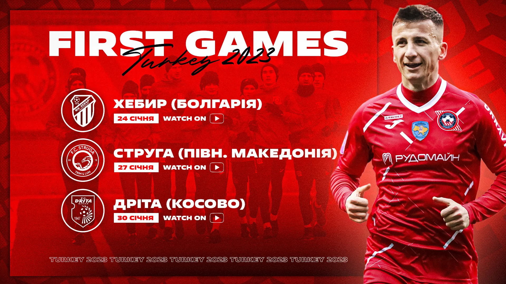 По сообщению официального сайта криворожцев, подопечные Юрия Вернидуба на втором сборе проведут 3 контрольных поединка. Соперниками "бело-красно-черных" будут: болгарский Хебир, северомакедонская Струга и косовская Дрита.