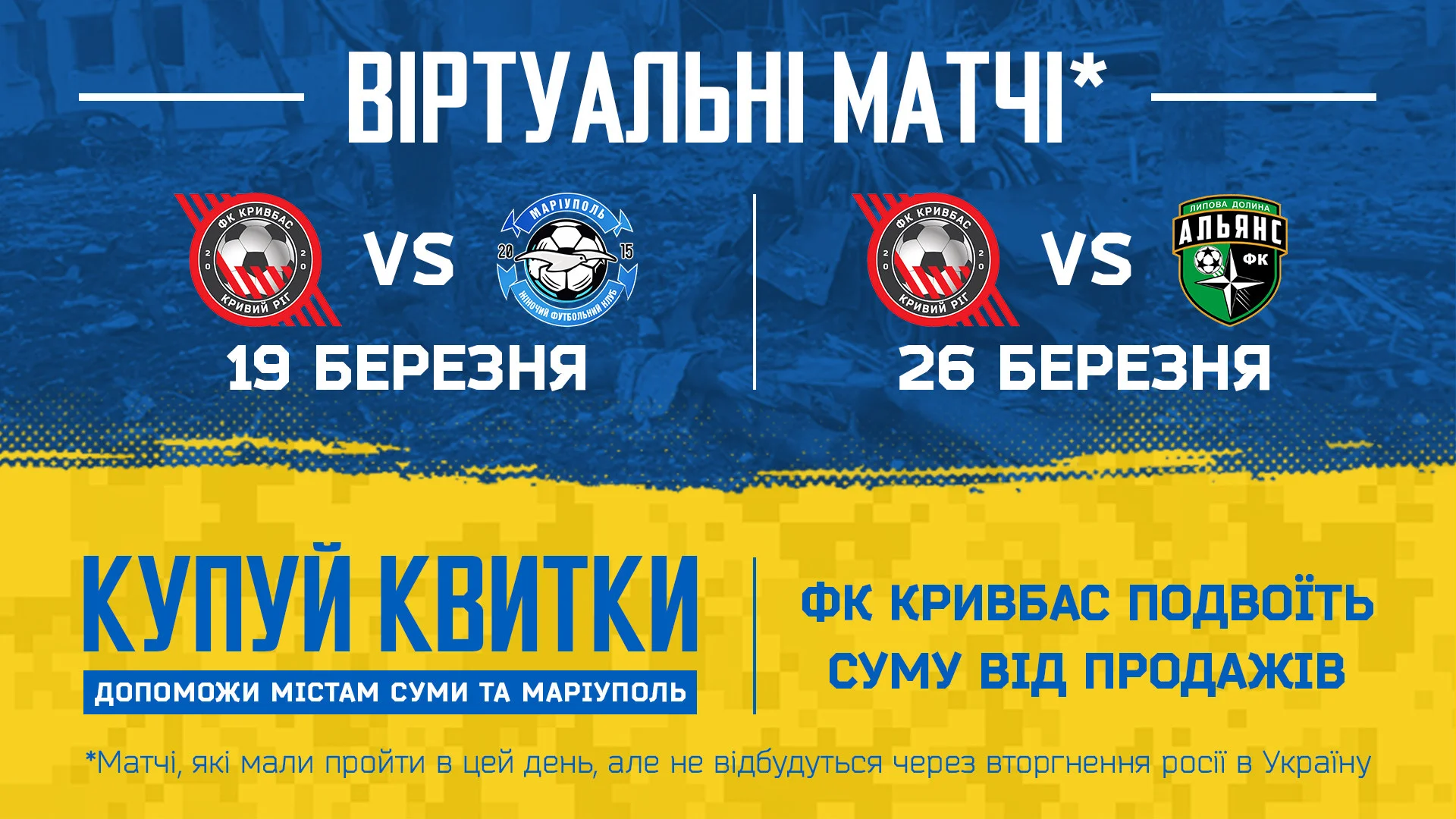 По информации пресс-службы, клуб в благотворительных целях открывает продажу билетов на несостоявшиеся матчи. Все собранные средства будут направлены на гуманитарную помощь жителям Мариуполя и Сум. К слову, Кривбасс удвоит сумму, полученную от продажи виртуальных пропусков.