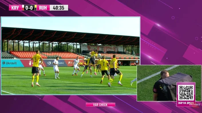 Через несколько минут Дмитрий Бондаренко уже слушал VAR по поводу пенальти в ворота Руха, после чего пошел смотреть повтор борьбы за мяч при подаче углового. Вердикт арбитра – пенальти в пользу Кривбасса. Очевидно, за игру рукой. Илич с 11 метров открыл счет. На этом первый тайм завершился.